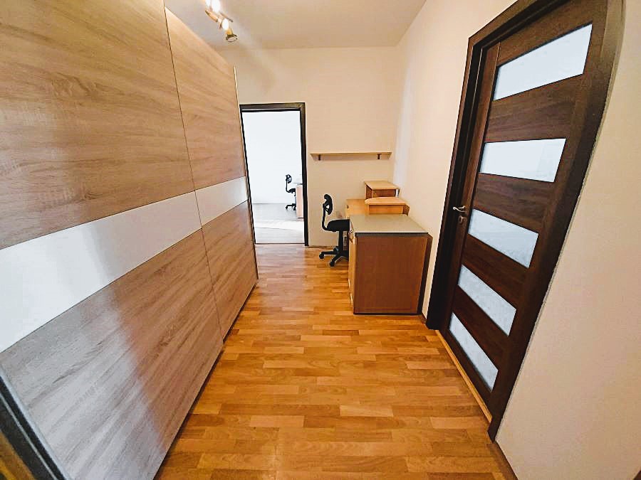 K dispozici kuchyně s kuchyňskou linkou a spotřebiči - sporákem, ledničkou s mrazákem. V bytě tři zařízené pokoje a prostorná hala. V bytě mnoho úložného prostoru ve vestavěných skříních na chodbě a v hale. V koupelně vana, pračka. Toaleta je samostatná mimo koupelnu.
