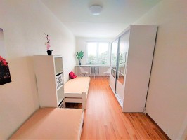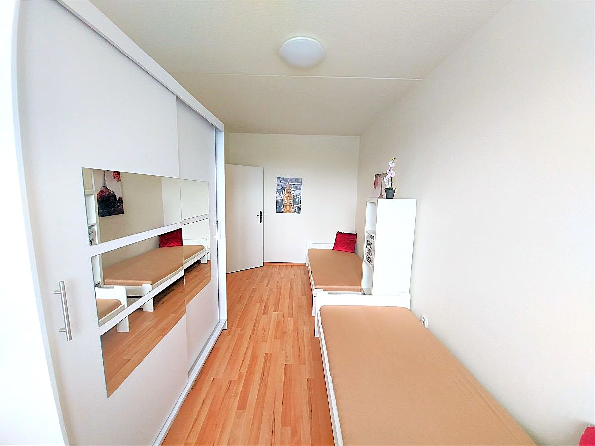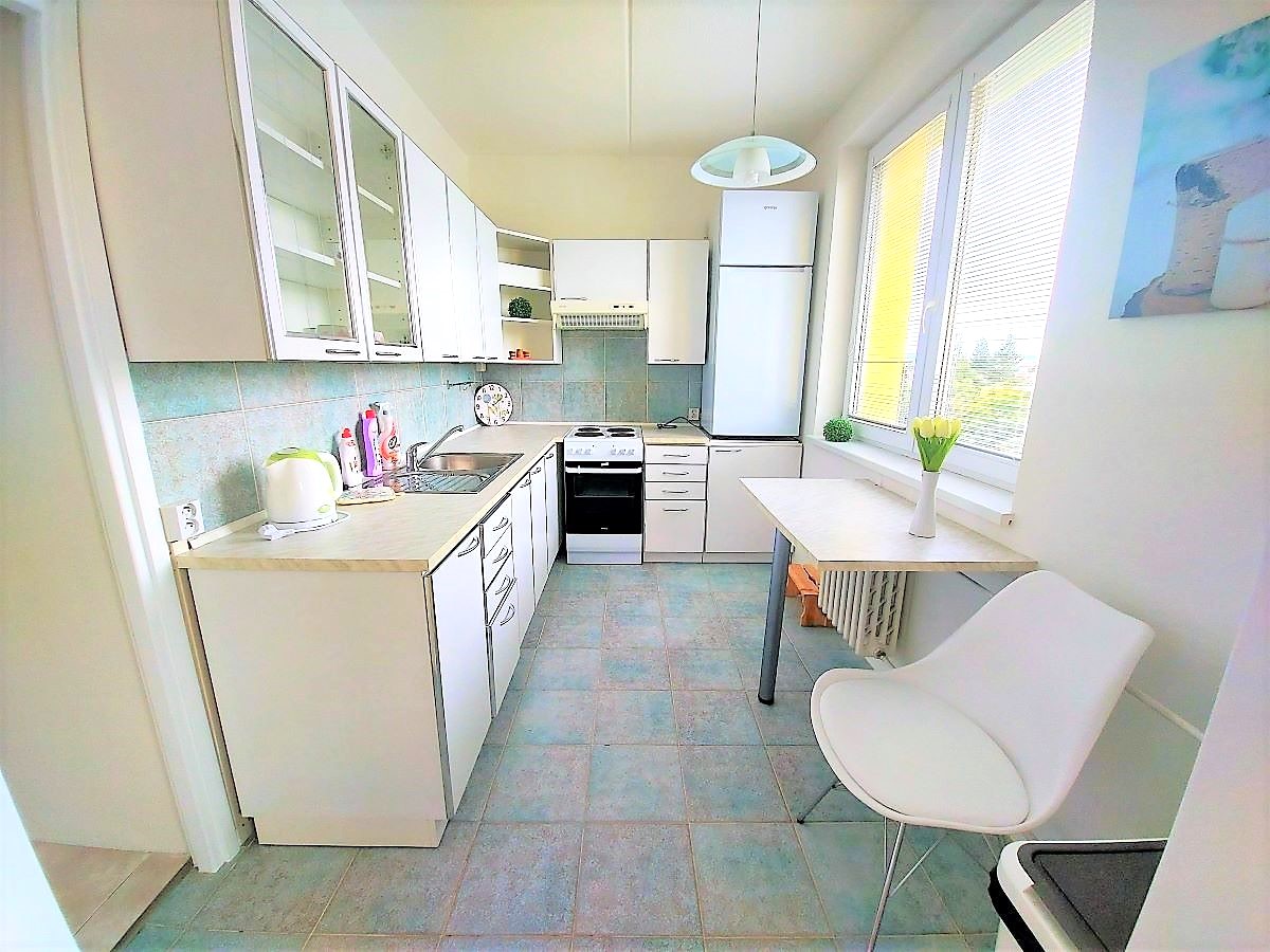 K dispozici kuchyňská linka se sporákem, stolem se dvěma židlemi. Z kuchyně vstup do dvoulůžkového, neprůchozího pokoje. V koupelně vana, toaleta samostatná mimo koupelnu. V bytě další dva samostatné pokoje, z nichž jeden je jednolůžkový a druhý dvoulůžkový. Byt je kompletně zařízený moderním a praktickým nábytkem.