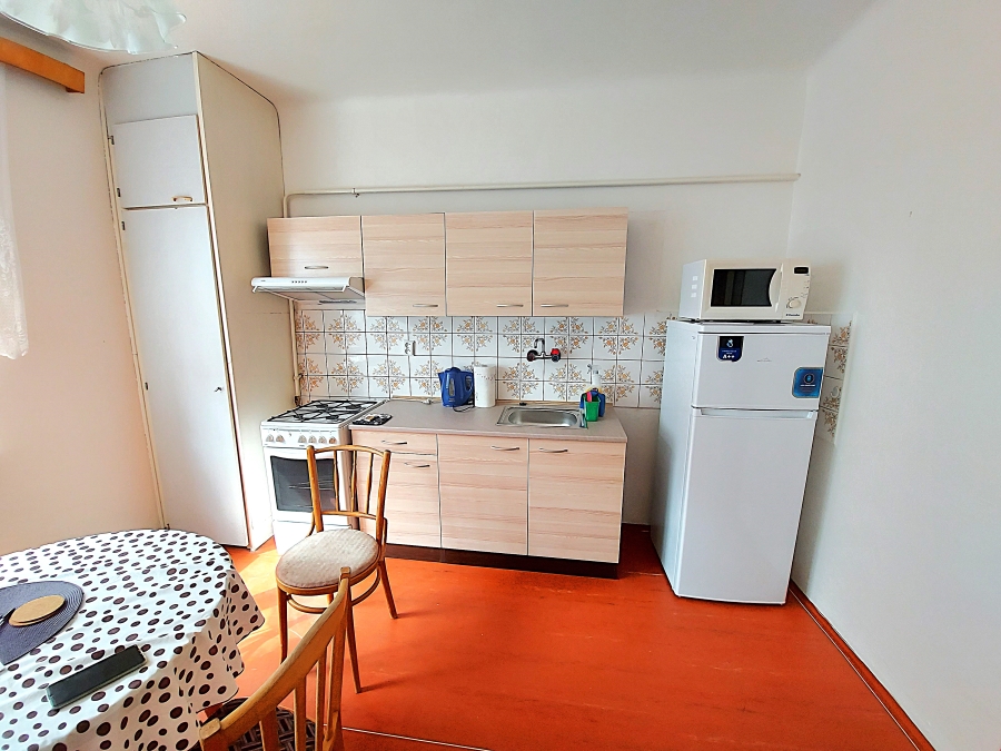 V kuchyni kuchyňská linka, sporák, lednička, mikrovlnná trouba, varná konvice a stůl se 4 židlemi.