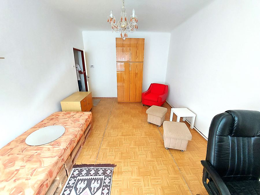 Pokoj se nachází v prvním patře bytového domu v bytě 3+1. Je neprůchozí a zařízený s balkonem. V pokoji, cca 17 m2, k dispozici 1x válenda, stůl se židlí, skříň, komoda. V koupelně vana, umyvadlo, koupelnový nábytek, toaleta samostatná mimo koupelnu.