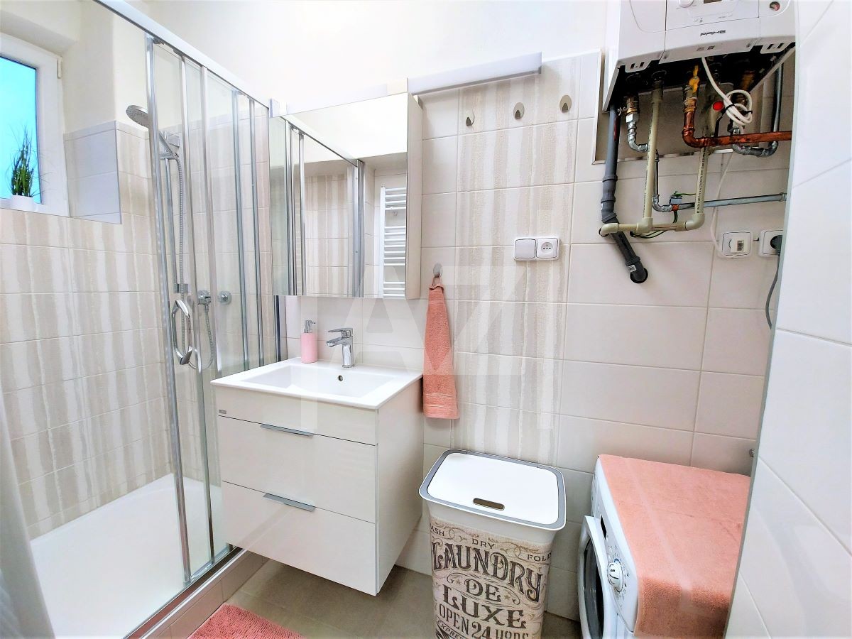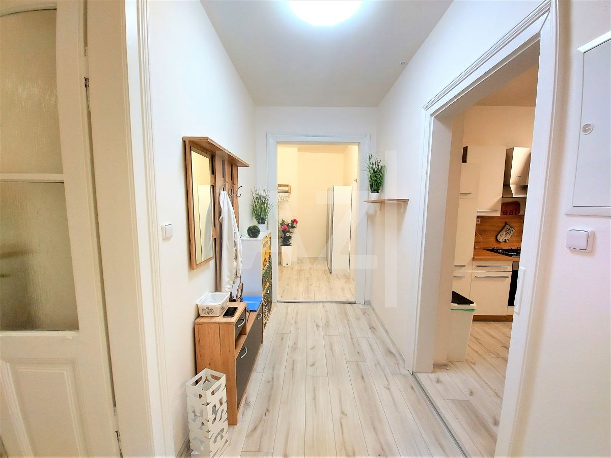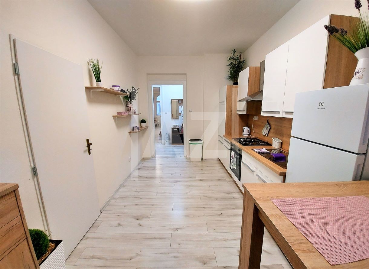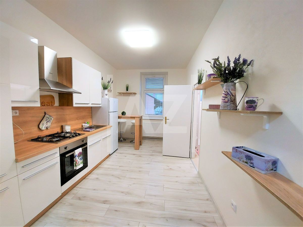 Byt je po kompletní a zdařilé rekonstrukci. Nabízí se v zařízené variantě. K dispozici kuchyně s kuchyňskou linkou a spotřebiči - sporákem, ledničkou s mrazákem, myčkou, mikrovlnnou troubou, varnou konvicí, stolem s barovými židlemi a běžné vybavení do kuchyně.