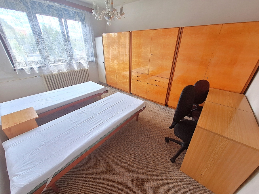 K dispozici dvě válendy, psací stoly, židle, lampičky, , šatní skříň, komoda. nábytek. Na patře domu koupelna a toaletou. O patro níž je společná kuchyně se sporákem, ledničkou s mrazákem a základním vybavením.